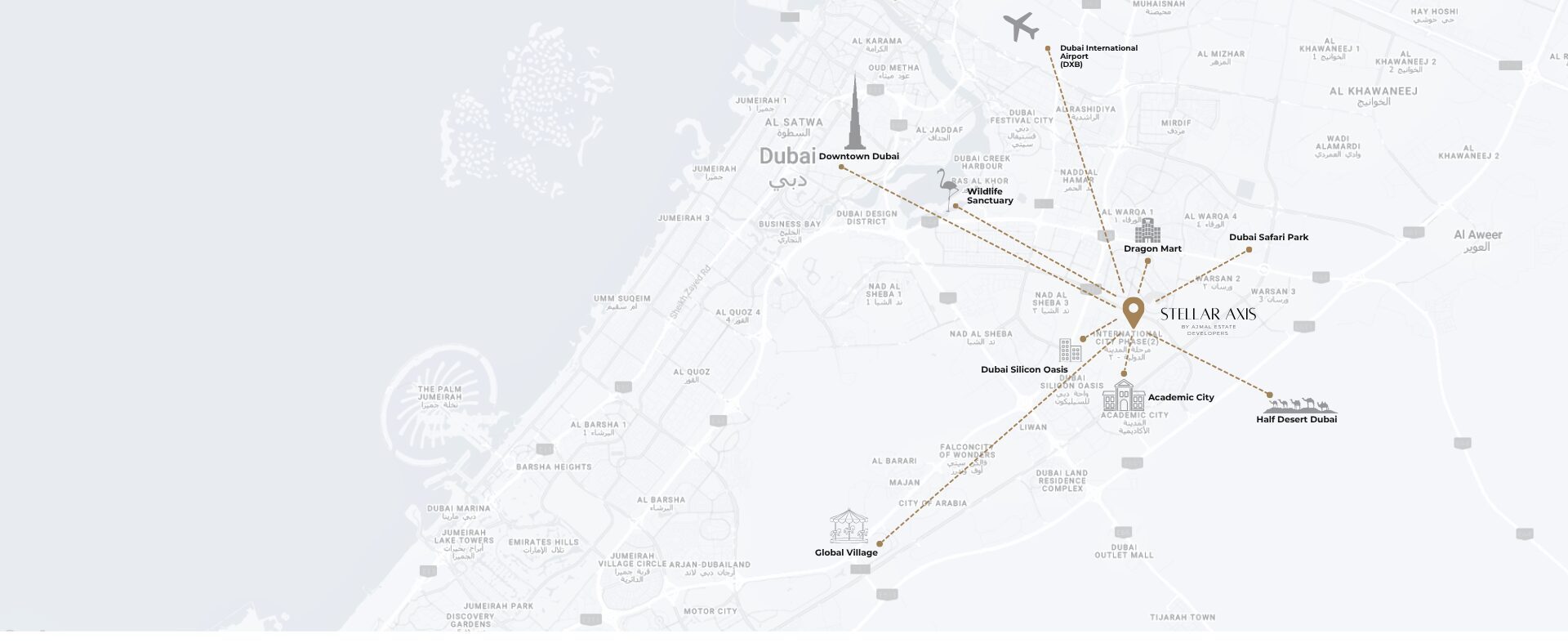 Stellar Axis is a continuation of Ajmal’s legacy, a mid-rise, mixed-use residential development located in the growing community of International City Phase 2 (Warsan 4), Dubai.